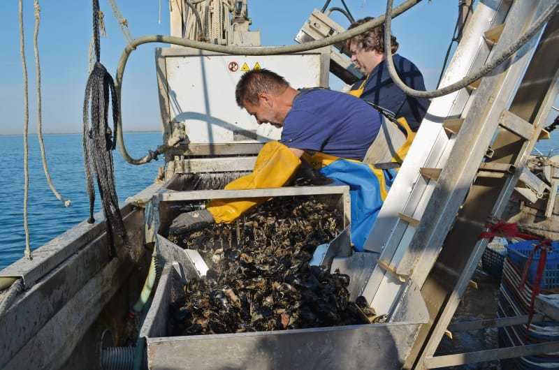 Beim Auslaufen erzählt mir Enrico ein wenig aus seinem Leben: „Ich habe früher als Koch gearbeitet, aber der Stress und die vielen Stunden waren mir zu viel. Also kaufte ich vor zwanzig Jahren ein Schiff und begann, mit Miesmuscheln meinen Lebensunterhalt zu verdienen. Harte Arbeit, aber schön ist es da draußen auf dem Meer!“ Mittlerweile liegt schon das Bojenfeld vor dem Bug, geschickt steuert Enrico das Schiff durch das Gewirr an Bojen. Auf dem Deck liegen Netze, prall gefüllt mit Miesmuscheln. Enrico klärt mich auf: „Diese Muscheln haben wir gestern geerntet und dann nach der Größe sortiert, gereinigt und wieder in Netze gefüllt, heute kommen sie wieder ins Wasser. Bis zur essfertigen Muschel muss man sie vier- bis fünfmal aus dem Wasser holen und reinigen und sortieren.“ Mit zwei Edelstahl-Ankern legt er an den Bojen an und holt das Tau, an dem die Netze befestigt werden, aus dem Meer. Flink werden die Muscheln in den Netzen daran befestigt und wieder ins Wasser gelassen. Mit an Bord ist Walter Rejec, ein Slowene, der schon lange am Schiff arbeitet. Walter schleppt die 25 kg schweren Netze vom Deck zur Bordwand und lässt sie Enrico anbinden, dabei kommt er ganz schön ins Schwitzen. Dann wird das nächste Tau heraufgeholt, und es beginnt von vorne.