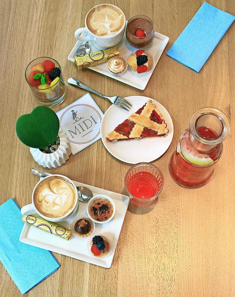 Und das haben die beiden an ihren Standorten einwandfrei umgesetzt. Etwa durch den „Café Gourmand“. Die Idee zu dieser süßen Verführung hatten zwei Pariser Patissiers vor rund zehn Jahren. Sie wollten ihr ganzes Können auf einem kleinen Teller zeigen und kreierten verführerische Mini-Versionen ihrer Tartelettes, Cannelés, Creme brulee- oder Mousse au Chocolat-Variationen und ließen sie zusammen mit einem Espresso oder Café au Lait servieren – stilecht arrangiert auf einem länglichen Porzellan-Teller oder einer Schiefertafel. Die Vorteile des Angebots liegen auf der Hand: Die Gäste müssen sich nicht für ein Dessert entscheiden. Und das Angebot ist zeitsparend für die Gäste und das Servicepersonal in der ohnehin immer knappen Mittagspause.  Auf der Karte steht der Überraschungskaffee allerdings nicht. Was beim Café Gourmand serviert wird, bleibt ein süßes Geheimnis. Im Midi jedenfalls ein äußerst köstliches.