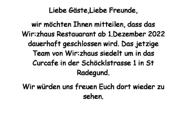 Wo Schatten ist, das ist auch Licht: Das "Wir:zhaus"-Team wechselt nun ein paar hundert Meter weiter ins Curcafé im Ortszentrum. Ivanova führt dort seit zwei Jahren ebenfalls den Betrieb. Seit Anfang Dezember gilt diesem Betrieb nun die volle Konzentration. Den Koch nimmt sie jedenfalls mit.