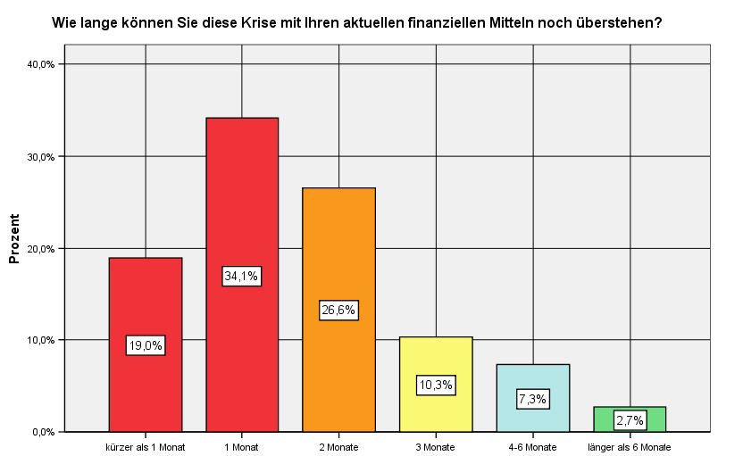 Die Ergebnisse der Studie belegen, dass die Gastronomie unter einem enormen Liquiditätsdruck steht. Demnach fürchten 66% der Betriebe, dass die Corona-Krise mindestens 2 Monate dauern wird. Mehr als die Hälfte der Betriebe kann die Corona-Krise maximal einen Monat aus eigener Kraft überstehen. Hier sind es vor allem Jungunternehmer (Betriebsführungsdauer <1 Jahr) und Kleinbetriebe (bis 5 Mitarbeiter), die massive Liquiditätsprobleme haben.  85 Prozent der Betriebe benötigen dringend eine rasche Auszahlung von (staatlichen) Hilfsgeldern/Förderungen/etc., und mehr als 60 Prozent der Betriebe fordern einen raschen Zugang zu Überbrückungsfinanzierungen durch Banken.
