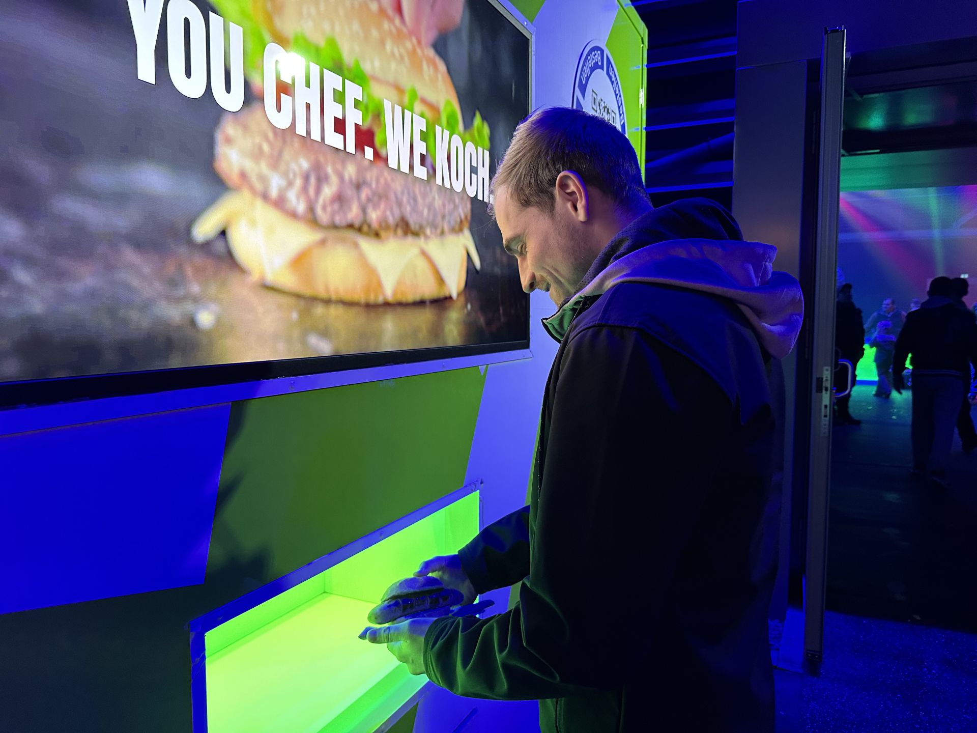 Das TKWY-Mobil ist kein gewöhnlicher Imbisswagen. Es gibt kein Servicefenster für die Bestellung, sondern nur ein großes Display. Bestellungen und Bezahlung funktionieren hier ausschließlich digital, das heißt die Gäste ordern und bezahlen direkt am Handy. Per Nachricht werden diese dann informiert, wenn das Essen abholbereit ist. Der Vorteil: statt sich in Schlangen anzustellen, können die Gäste überall ordern. Und die Mitarbeiter Imbisswagen müssen nicht zwischen Aufnahme von Bestellungen und Bezahlung bzw. Ausgabe jonglieren.