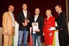 KommR Ing. Josef Bitzinger (Obmann der Sparte Tourismus und Freizeitwirtschaft, Wirtschaftskammer Wien), Gewinner „Goldener Schani 2011“ in der Kategorie „Traditioneller Schanigarten“ Stefan Draxler (Patara - Fine Thai Cuisine) mit Begleiter, KommR Brigitte Jank (Präsidentin Wirtschaftskammer Wien), Goldener Schani