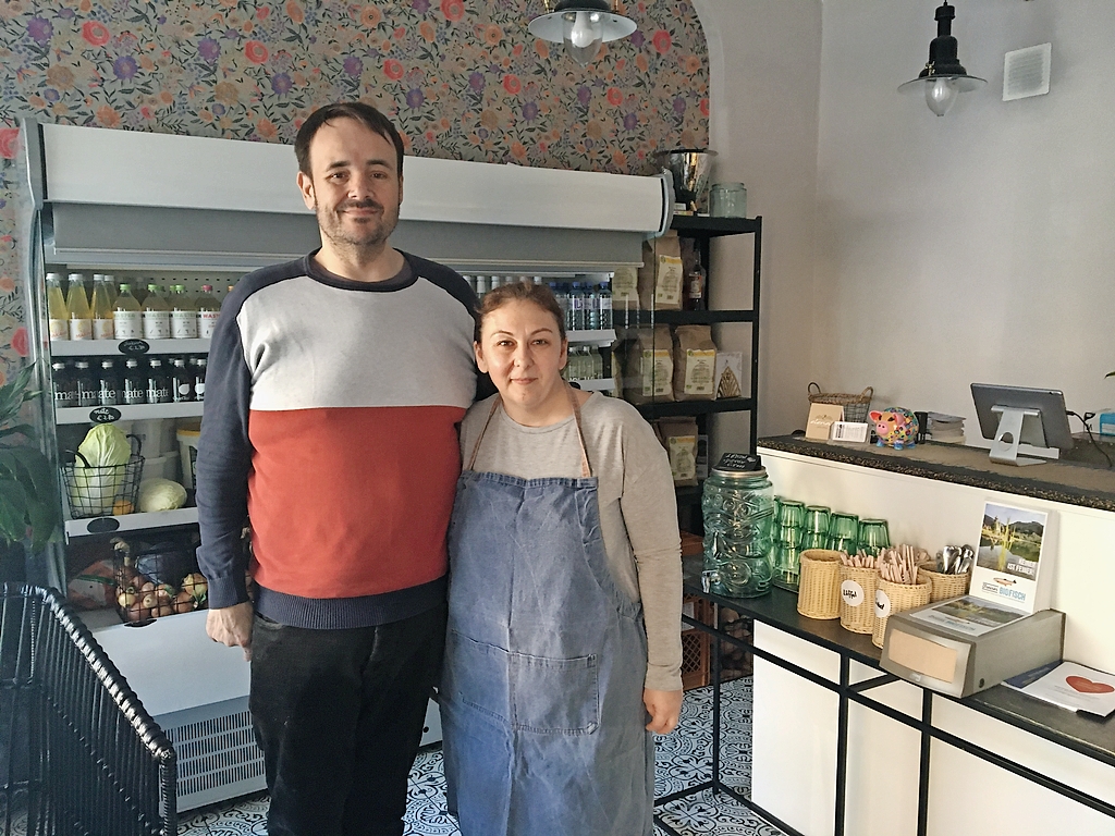 Gegenüber hat das israelische Pitalokal Hungry Guy geöffnet. Das heißt, in der offenen Tür steht ein runder Tisch, der als Sperre fungiert. Hier kann man sein Essen oder Getränke zum Mitnehmen bestellen. Das Lokal ist komplett leer, bis auf eine junge rothaarige Frau und ihr männlicher Kollege in der offenen Küche. „Wie laufen die Geschäfte“, frage ich die rothaarige Gonca, als sie zur Sperre gekommen ist. „Mäßig“, sagt sie. Da tritt ihr Chef dazu, Eyal Guy. Er sagt: „Ich mache das hier nur, damit ich meine Angestellten irgendwie halten kann. Und um ein Zeichen zu setzen. Lohnen tut sich das überhaupt nicht.“