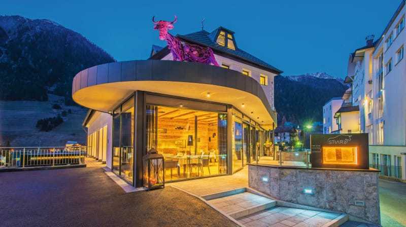 Mit der heurigen Saison kam mit dem passenderweise „Stiar“ (Stier) benannten Gourmet-Restaurant ein neuer interner Abnehmer in der Silvretta-Gruppe (zu dem noch die Bar „Kuhstall“ und das Lokal „Bärafalla“ gehören). Gunther Döberl als Küchenchef fungiert auch als Sparringpartner: Für das Burger-Brot etwa hat er die Rezeptur erarbeitet. Mit dem „Stiar“ bespielt der früher schon im Ort (Hotel Romantica) auf Hauben-Niveau tätige Koch eine exklusive Bühne für 20 Gäste. Dekonstruierte Klassiker der Tiroler Küche sind sein Markenzeichen. Als Speckstein kommt Fleisch vom Maashof gleich beim Amuse Bouche auf den Tisch. Die „g’rösteten Knödel“ interpretiert Döberl als knusprige Würfel mit warmem Eidotter. Um Nachschub braucht er sich nicht zu sorgen. Die Gams liefern die Jäger, mitunter wird auch ein Reh, das Zangerl-Sohn Bernhard erlegt hat, verkocht. Oder es kommt einer der Lammrücken aus dem Kühlhaus zum Einsatz.