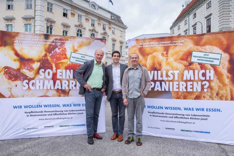 „Wir müssen den Betrug an den Konsumenten beenden und für Transparenz am Teller sorgen. Wenn jemand wirklich das Schnitzel vom kranken Kalb aus holländischer Massentierhaltung oder den Kaiserschmarrn mit Käfig-Ei aus Aserbaidschan essen will, dann ist das seine Entscheidung. Aber wer das nicht will und lieber 10 Cent mehr pro Portion zahlen möchte, um den Tieren, Umwelt & Klima und unseren Bauern zu helfen, soll auch die Möglichkeit dazu erhalten“, sagt Sebastian Bohrn Mena, Initiator des Tierschutzvolksbegehrens. Die verpflichtende Kennzeichnung der Lebensmittel nach Herkunft & Tierwohl ist eine zentrale Forderung des Volksbegehrens.