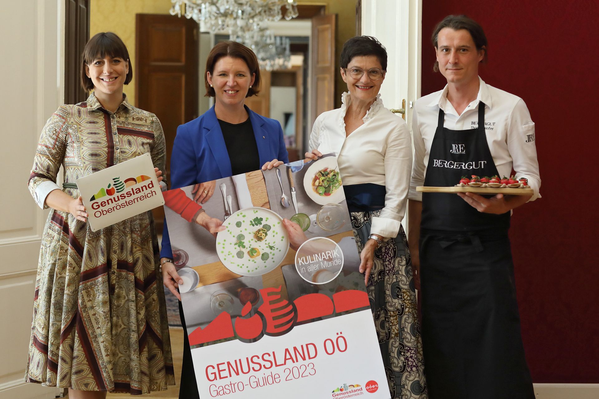 Bild oben: Stabstellenleiterin Genussland OÖ Birgit Stockinger, Ernährungs-Landesrätin Michaela Langer-Weninger, Geschäftsführerin Verein Genussland OÖ Marketing Gastro & Kulinarik Margit Steinmetz-Tomala und 2-Haubenkoch Thomas Hofer