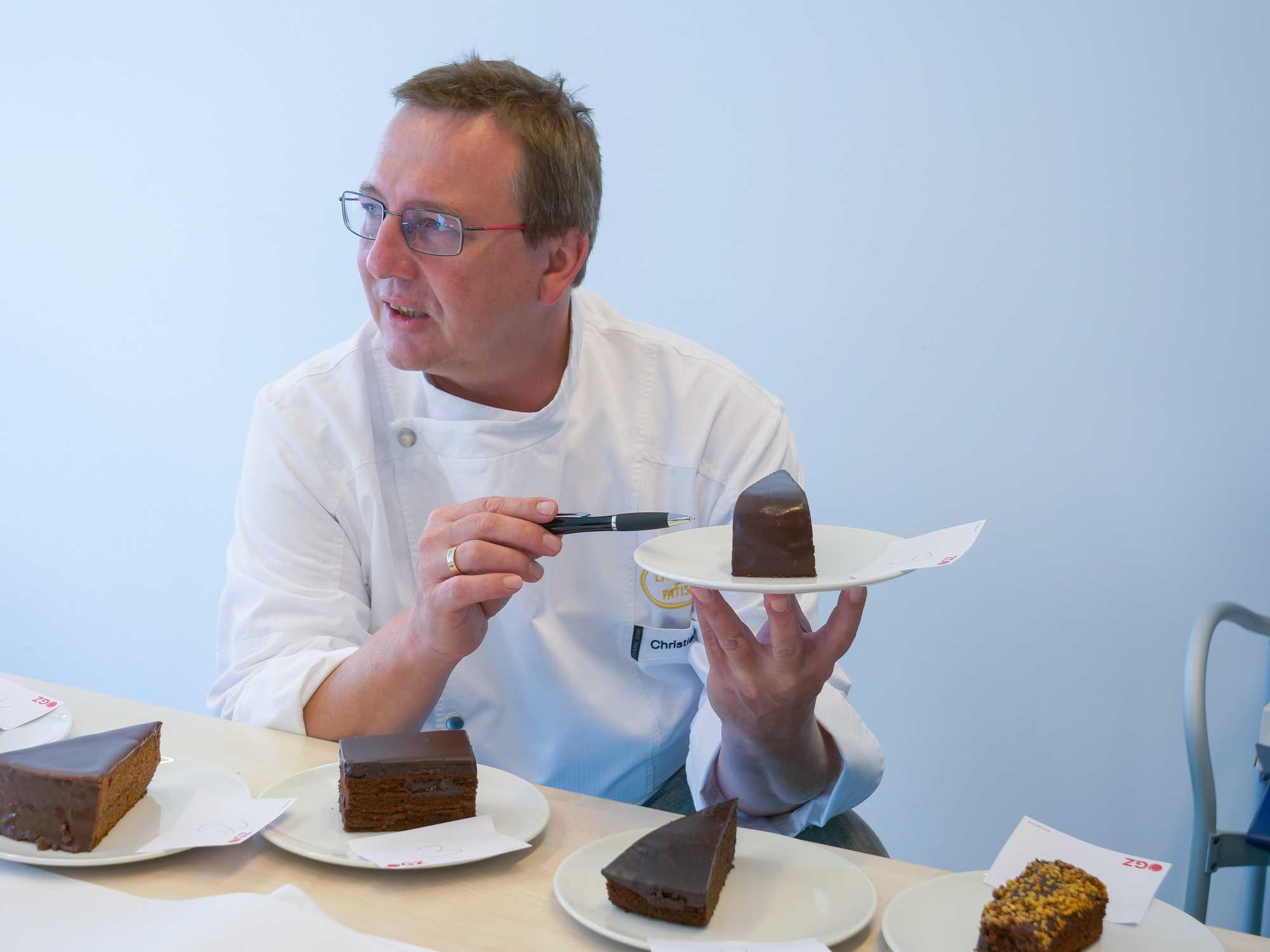 Ein Torten- oder Mehlspeis’-Stück, das weniger als vier Zentimeter Höhe hat, wirkt nicht gut”, sagt Christian Haller, Pâtissier und Betriebsleiter von Querfeld’s Wiener Konditorei GmbH (www.landtmann-patisserie.at) zu Beginn der ÖGZ-Verkostung. Wir haben namhafte Anbieter gebeten, Proben ihrer Apfelkuchen und Schokokuchen bzw. Torten einzusenden. Verkostet wurde blind, der Chef-Pâtissier der Landtmann-Betriebe wusste also nicht, hinter welchem Anbieter welche Probe steckt.