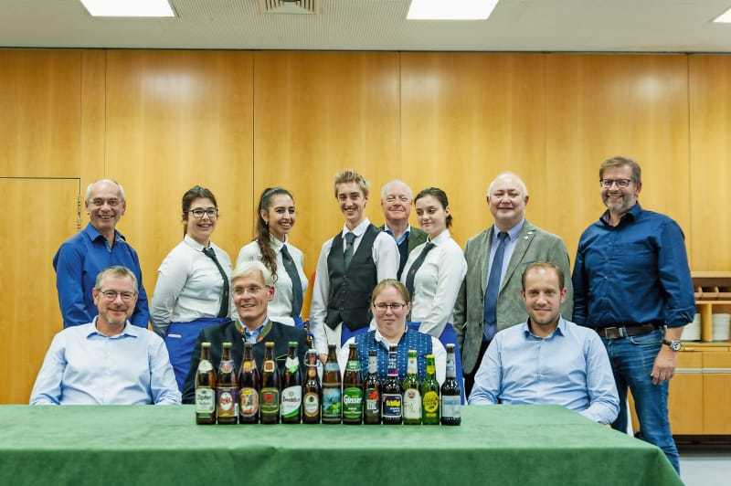 Gruppenbild mit Schülern in der Berufsschule für Gastgewerbe in der Wiener Längenfeldgasse. Stehend (v. l.): Ludwig Mühlhofer (Stieglbrauerei), Christoph Scheriau (Raschhofer),  Robert Raidl (Berufsschule Längenfeldgasse), Reinhard Bayer (Stift Schlägl). Sitzend (v. l.): Heinz Wasner (Brauerei Zwettl), Andreas Urban (Schwechater Brauerei, Juryvorsitzender), Nicole Wassermann (Bräu am Berg), Michael Göpfart (Brauerei Murau).