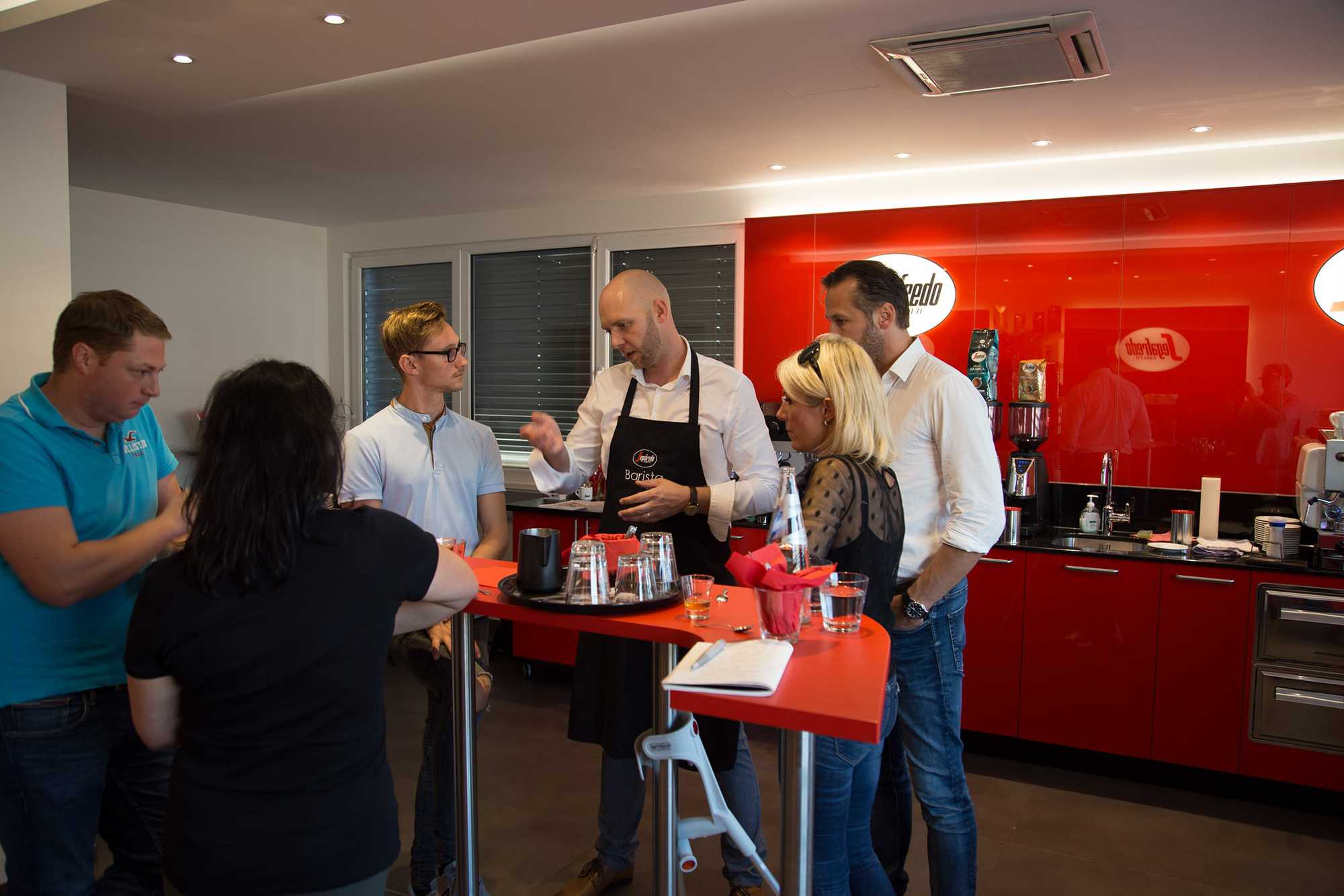 Noch interessanter ist dann die sensorische Verkostung in der Scuola di Barista gleich nebenan. Stefan Anzinger lässt uns zunächst sauer, süß und bitter schmecken, erklärt woran man den „Körper“ eines Kaffees erkennt und dass man wie bei einem Wein auch auf den Abgang achten muss. Mit einer sogenannten Drittelbrühung führt er uns anschaulich vor, wie sich die Brühzeit auswirkt: Kurze Brühzeit (bis zu 8 Sek) lässt den Kaffee sauer schmecken, danach entwickelt sich erst der Körper (8–16 Sek) und am Ende kommen die Bitter- und Gerbstoffe dazu (bis 24 Sek).