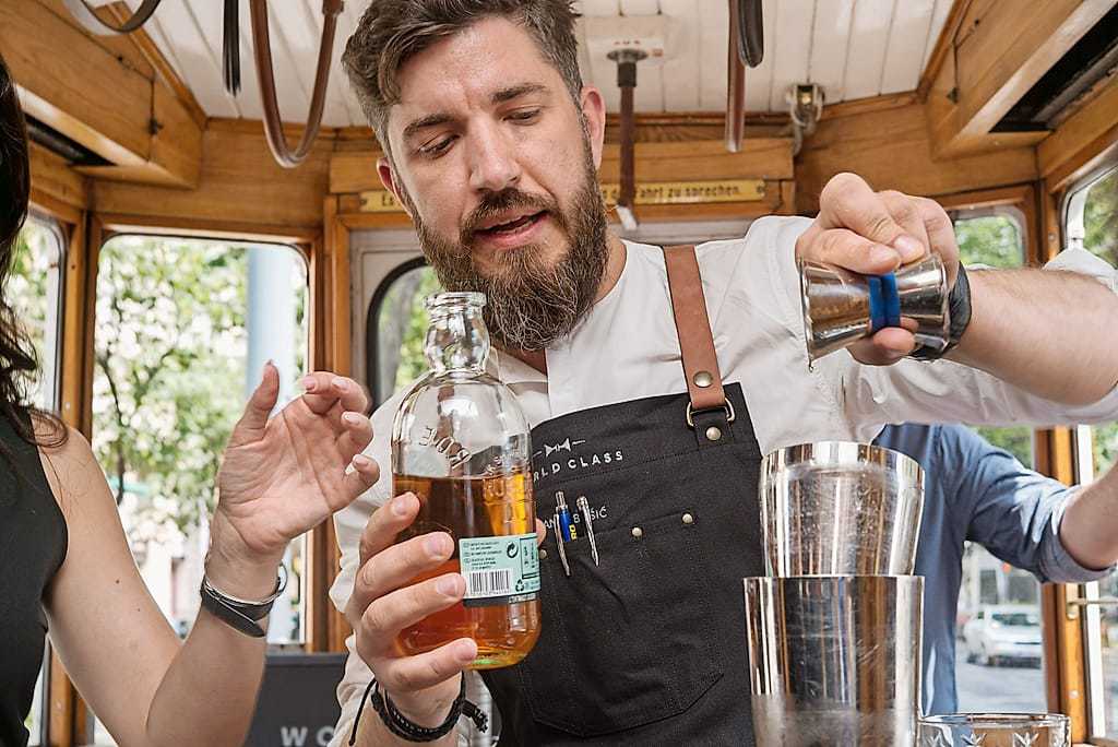 Am Dienstag ging es spannend weiter. Denn die Herausforderung bei der „Back to School“-Challenge bestand darin, in einer Wiener Bim, zusammen mit einem zugewiesenen Partner, einen individuell zugeschnittenen Drink, inspiriert von zwei Mitbringseln des Gastes, zu entwickeln, gemeinsam zu mixen und der Jury zu präsentieren. Dabei punkteten die Finalisten mit Teamwork sowie mit einer spannenden Darbietung der eigenen Cocktailkreation. Diese musste gekonnt sowohl der Jury als auch Laien erklärt werden.