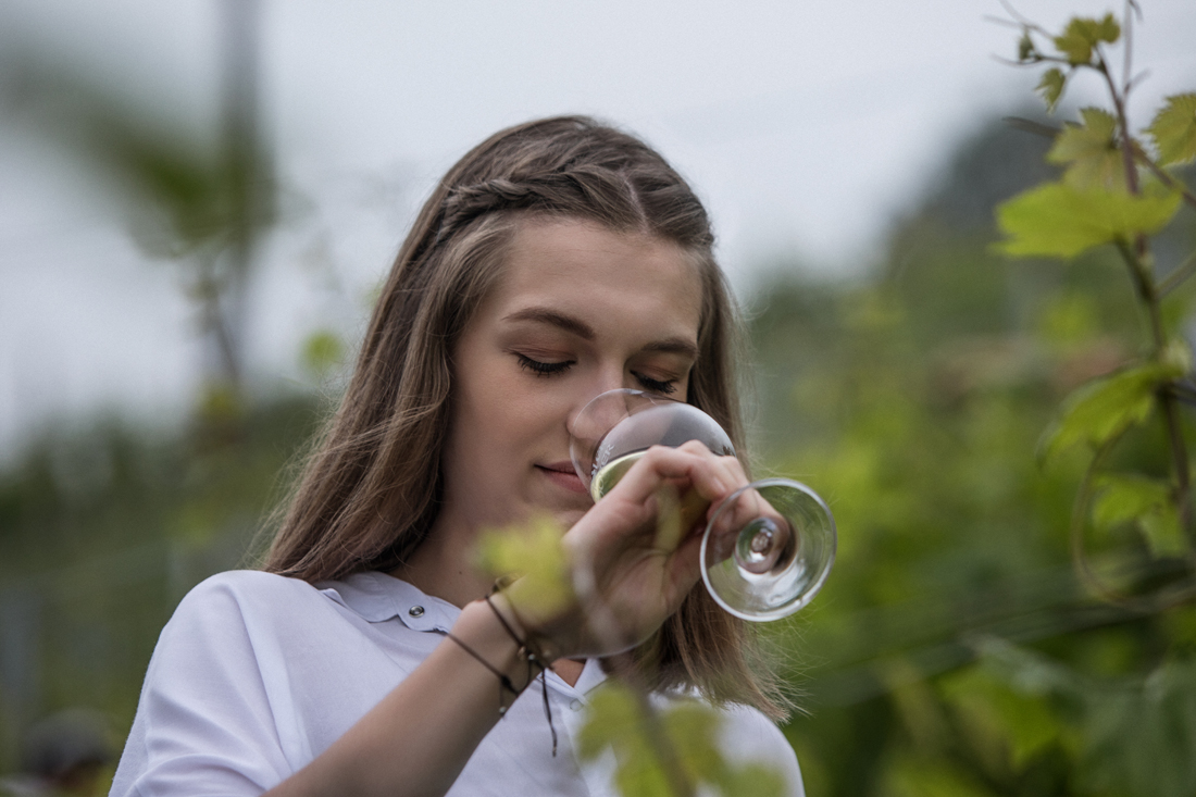 Eine Frau nippt im Weinberg an einem Glas Wein.