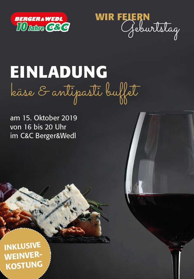 Der C&C-Markt Berger&Wedl feiert sein 10-Jahr-Jubiläum: Am 15. Oktober gibt es von 16 bis 20 Uhr neben einem Käse- und Antipasti-Buffet auch eine Weinverkostung sowie Edelspirituosen. Unter den teilnehmenden Winzern u.a.: Alphart, Gollenz, Birgit Eichinger, Jurtschitsch sowie Spirituosen von Freihof.
