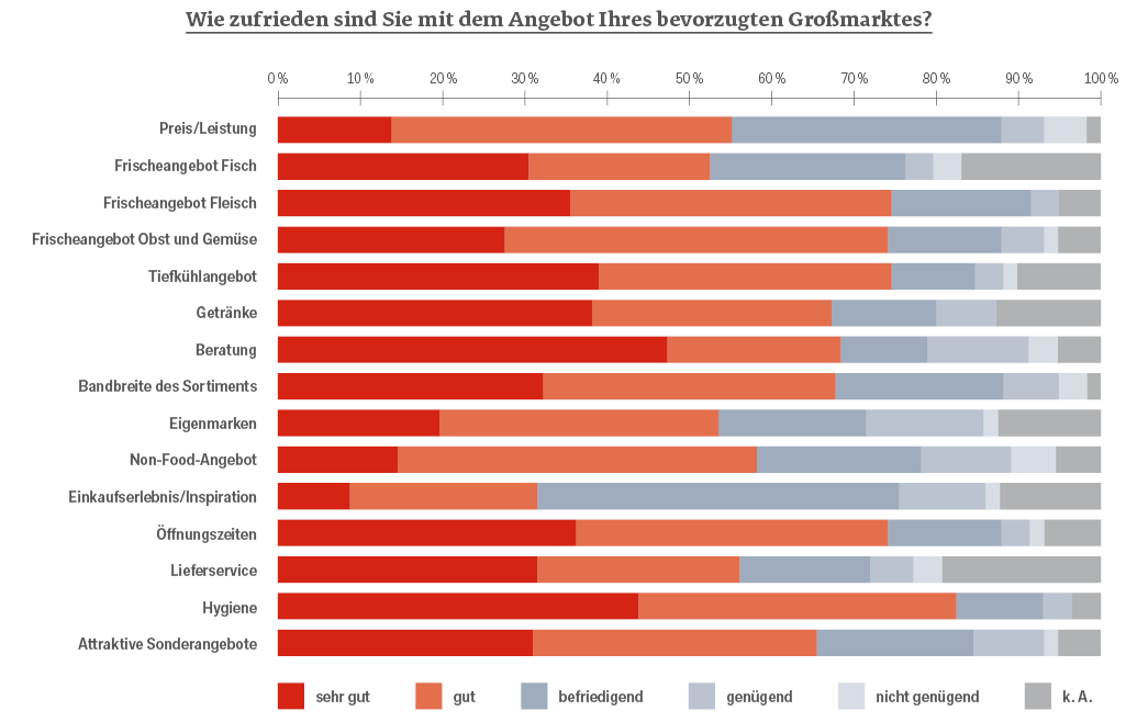 Anhand einer Skala (nach dem Schulnotenprinzip) wollten wir die Zufriedenheit der Kunden erfahren. Hier können die Großmärkte eine hauptsächlich positive Bewertung ihrer Kunden einfahren. Speziell die Themen Beratung und Hygiene werden überwiegend mit „sehr gut“ bewertet. Insgesamt liegen die meisten der untenstehenden Punkte (siehe Tabelle) klar im positiven Bereich. Einzig das Einkaufserlebnis bzw. die Inspiration vor Ort zeigt noch ein ziemliches Potenzial nach oben. Worauf die unterschiedlichen Anbieter bekanntlich auch reagieren – und verstärkt in die Erneuerung bzw. Neukonzeption der C+C-Märkte investieren.