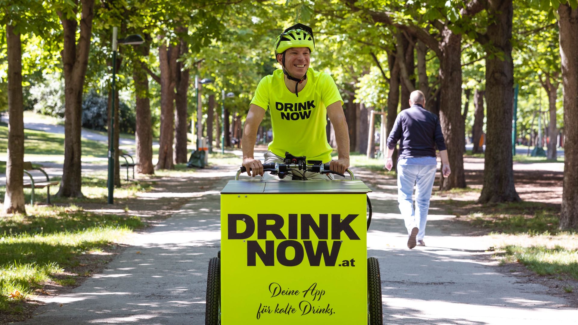 Was ist gelb, hat drei Räder und einen Kühlraum, der mit "Erfrischungsgetränken" gefüllt ist und wird mittels Muskelkraft durch Wien bewegt? Richtig, eines von insgesamt sechs  E-Lastenbikes, das von Donnerstag bis Sonntag zwischen 14 und 22 Uhr in der Stadt unterwegs ist. Die Gratis App "Drink now" ortet die bestellende Person, die Bestellung wird sodann direkt an den Standort zugestellt - mittels E-Lastenbike. Das Liefergebiet umfasst die Wiener City – ca. 5 Kilometer rund um den