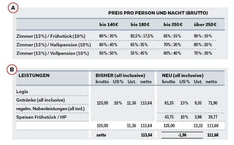 Ein Kennzeichen der Ferienhotellerie ist der hohe Kostenanteil des F&B-Bereiches. Neben dem Frühstück und Abendessen wird in vielen Hotels noch ein Nachmittags- und Mittagssnack angeboten. Legt man nun die Einzelverkaufspreise für die Logis hoch und für das F&B niedrig an, nimmt man in Kauf, dass durch einen höheren Logisanteil ein höherer Anteil des pauschalen Entgeltes mit dem Umsatzsteuersatz für Logis (13 %) besteuert wird und insgesamt mehr Steuern abzuführen sind. Wird der reine Logisanteil niedrig und dafür das F&B hoch angesetzt, wird kein Gast mehr F&B buchen und das Hotel bekommt dadurch ein Marktproblem.