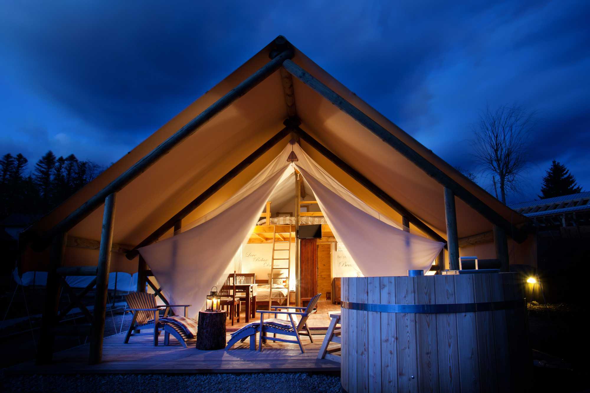 Ein schmaler Weg schlängelt sich vom Eingang tief hinein in einen Garten. Tomaten, Gurken, Kürbisse, Melanzani, Zucchini: Rechts und links hängt Gemüse schwer an Sträuchern und Stauden, dazwischen wachsen Obstbäume voller Früchte. Jetzt erst fällt der Blick auf ein Gebäude aus Holz, das mitten im wildwachsenden Garten steht. Das dreieckige Dach, weiße Planen statt einer Türe und ein hölzerner Bottich neben der Veranda verraten, um welche Art von Tourismus es hier geht: Luxus-Glamping.