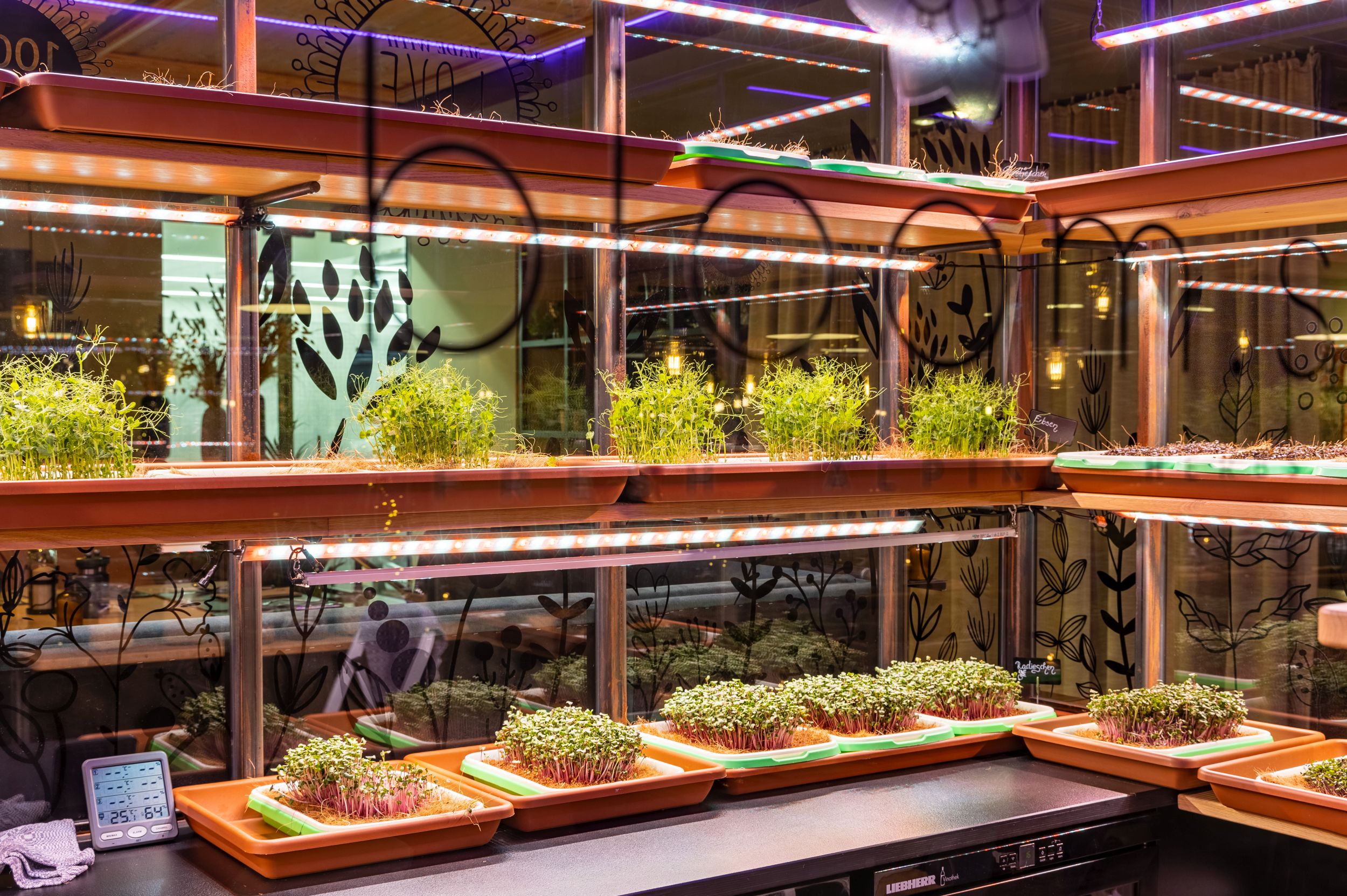 Und diese Kräuter, Sprosse und Salate aus der Indoor Farm mitten im Lokal findet der Gast dann direkt wieder auf den Tellern. Dort geben sie modernen internationalen Gerichten wie Curry, Wok-Gemüse oder Hummus sowie regionalen Spezialitäten das gewisse Extra. „Bei Microgreens und Sprossen handelt es sich ‚lediglich‘ um ein geschmacksverstärkendes und dekoratives Element eines Gerichtes. Dieses auf eine kilometerweite Reise aus fernen Gewächshäusern zu uns in die Berge zu transportieren, war mir schon immer ein Dorn im Auge. Als ich durch meine lokalen Partner von bloom.s Vertical Indoor Farm GmbH auch noch gelernt habe, wie simpel der eigene Anbau ist, war für mich klar, dass wir den ehemaligen gläsernen Weinraum mitten im Restaurant umfunktionieren müssen“, erklärt Benedikt Roos, Geschäftsführer des Mountain Hotel Luis.