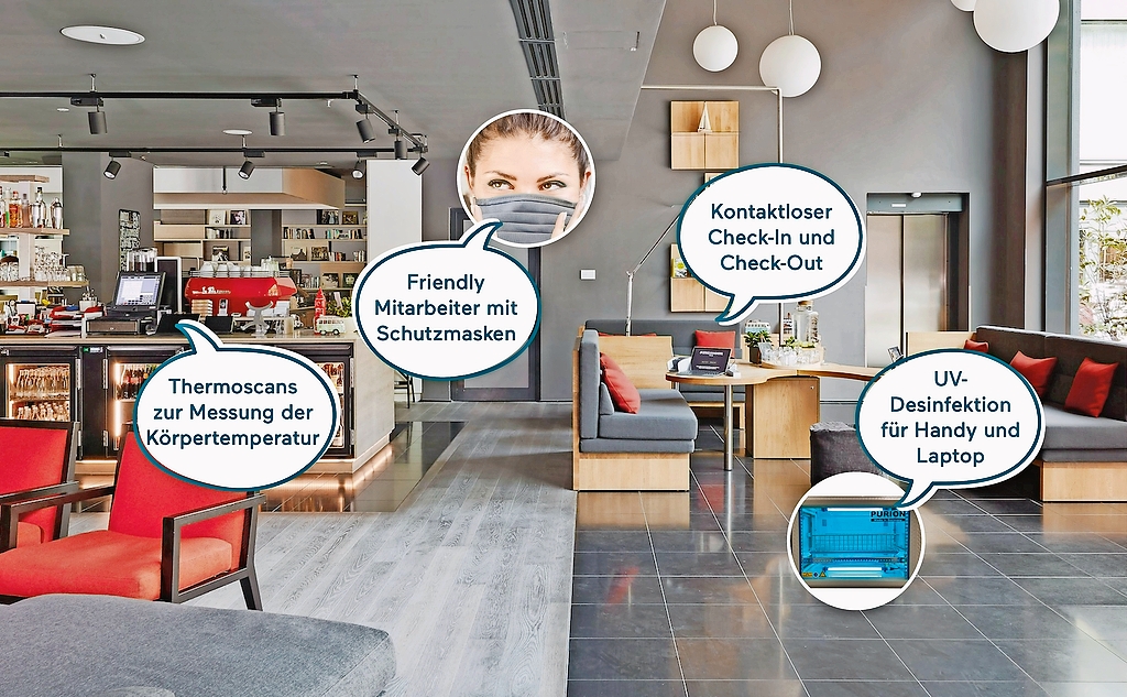 Das reicht vom kontaktlosen Check-in und Check-out bis zum standardmäßigen Highspeed-WLAN mit Druckerservice für Homeoffice auf den Zimmern, UV-Desinfektionsboxen und Gäste-Handys- und Tablets, Thermoscans in der Lobby, Ozongeräte zur Luftreinigung in den Zimmern und Frühstück a la Carte