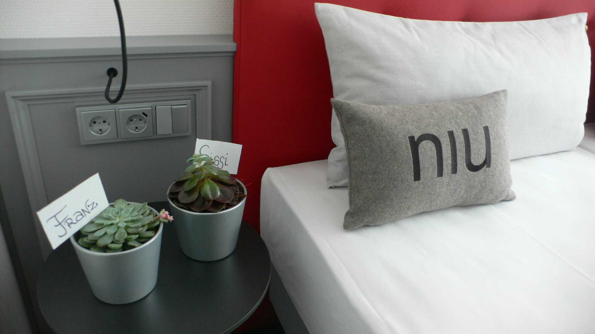 Beim Einchecken, gerne auch mit dem Handy, bekommt jeder Gast, der einen Euro übrig hat, einen Sleepover-Buddy: wahlweise „Franz“ oder „Sissi“. Das sind keine Stofftiere, sondern Zierpflanzen. Der Euro wird der Stiftung für Integrationsprojekte der Novum Hospitality zugeführt. Am Zimmer stehen auch Wasserflaschen von Viva con Agua, einem gemeinnützigen Verein, der sich für weltweiten Zugang zu sauberem Trinkwasser einsetzt.