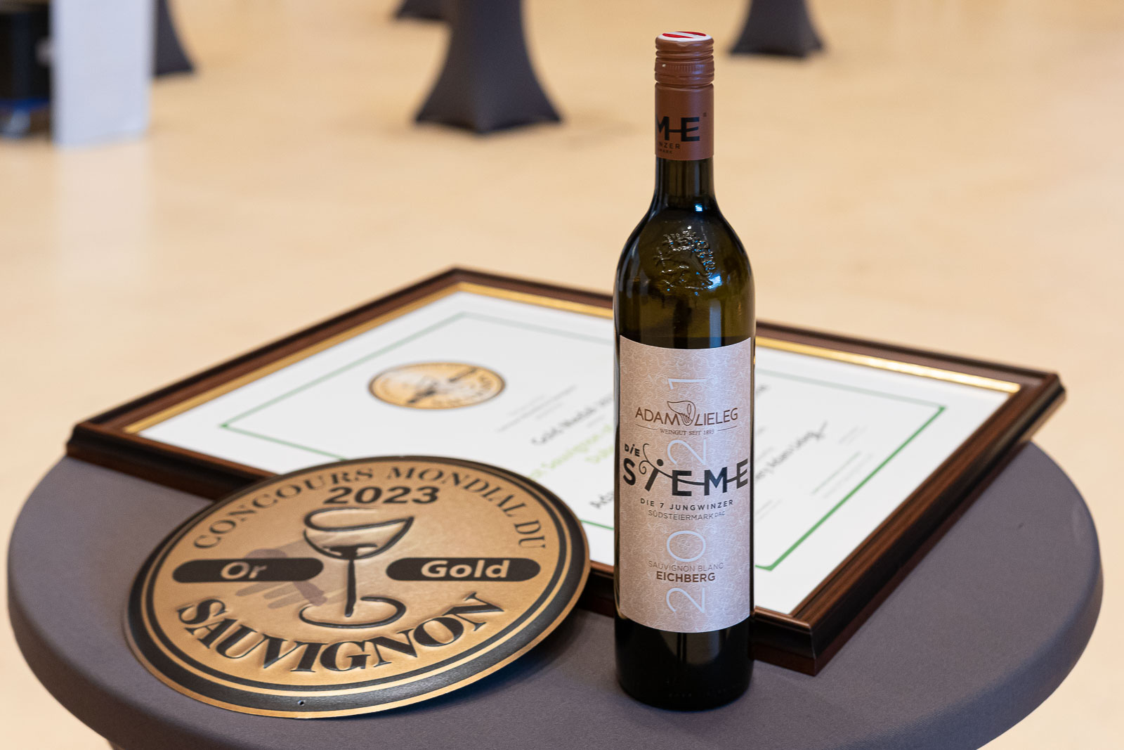 Das Weingut Adam-Lieleg gewinnt zwei Goldmedaillen und die Trophäe in der Kategorie Best Sauvignon of the competition, dem Wein 2021 Sauvignon Blanc Sieme Eichberg, Südsteiermark DAC