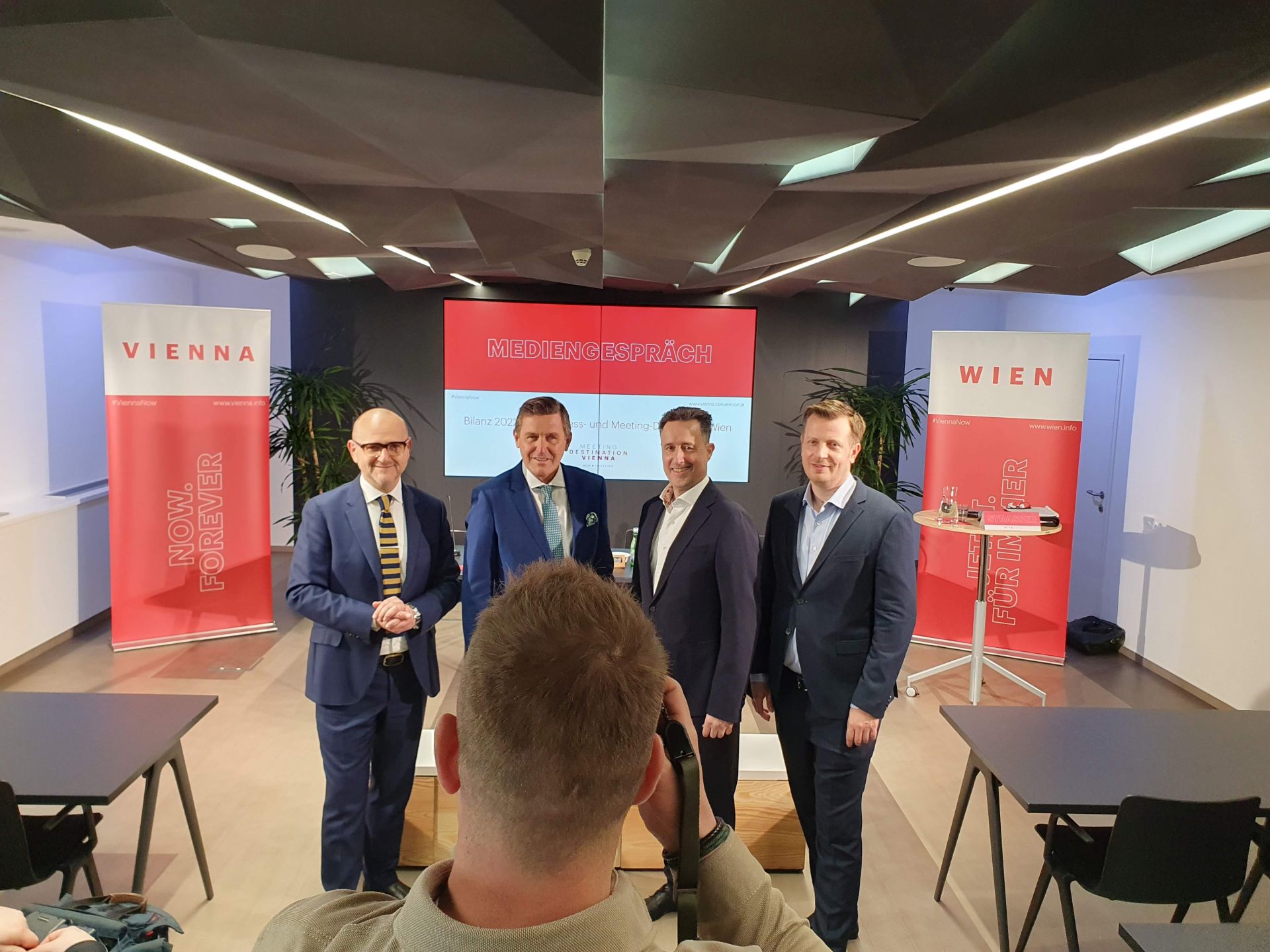 Bild oben: Chris Woronka (Bild rechts) bei der Präsentation der Tagungsbilanz 2022 im April 2023 mit Wien Tourismus-Chef Norbert Kettner, Finanzstadtrat Peter Hanke und WK Wien Tourismusobmann Markus Grießler.