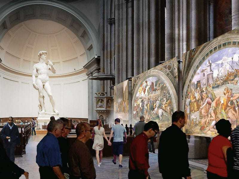 Der Geschäftsmann Wolfgang Grimme und der Bühnenbildner Manfred Waba hatten da eine Idee. Bereits 2016 hängten sie exakte Print-Reproduktionen der weltberühmten Freskengemälde der Sixtinischen Kapelle des Vatikans in die Wiener Votivkirche. Durchaus erfolgreich. 80.000 Besucher kamen. Das macht Lust auf mehr, und so stehen sie nun da: „Große Meister“ (der italienischen Renaissance). Grimme und Waba präsentieren diese Ausstellung den Gästen für einen stolzen Eintrittspreis von 15,50 Euro (50 Cent mehr als im Pariser Louvre!) in der Wiener Votivkirche mit einer Nachbildung von Michelangelos „David“ (aus Florenz) und 50 Gemäldereproduktionen. Und dabei handelt es sich um so etwas wie die Starparade der Werke der Hochrenaissance: Man muss also nicht mehr nach Mailand, um Leonardos Abendmahl zu sehen, nicht nach Paris für die „Mona Lisa“ oder die „Felsengrotten-Madonna“, nicht in den Vatikan, um Raffaels „Schule von Athen“ zu sehen,  und nicht in die Uffizien für Botticellis „Geburt der Venus“.