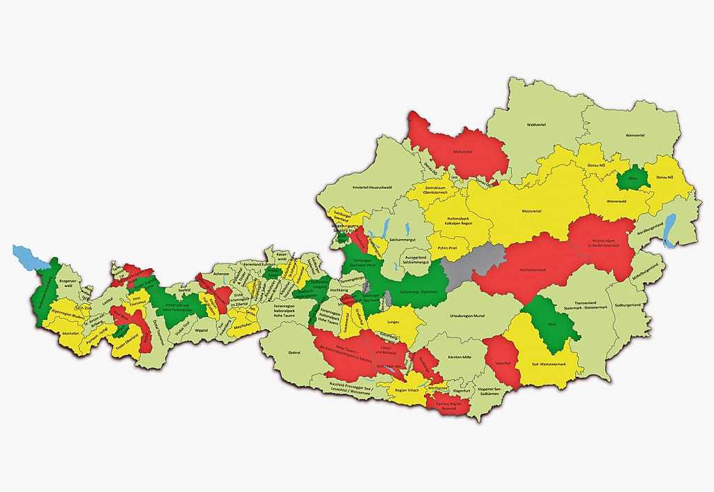 Das Tourismusjahr 2015/16 war insgesamt ein sehr positives, vor allem der Sommer – österreichweit betrachtet. Deshalb sollte man glauben, dass sich auf der Landkarte der ÖHV-Studie alle Destinationen im grünen Bereich bewegen sollten. Das Wesen der Destinationstudie ist allerdings, die jeweilige Performance relativ zu den anderen Destinationen auszuweisen: Wächst eine weniger als der Durchschnitt, macht sich das negativ bemerkbar. Sie hat von den guten Bedingungen für alle relativ weniger profitiert.