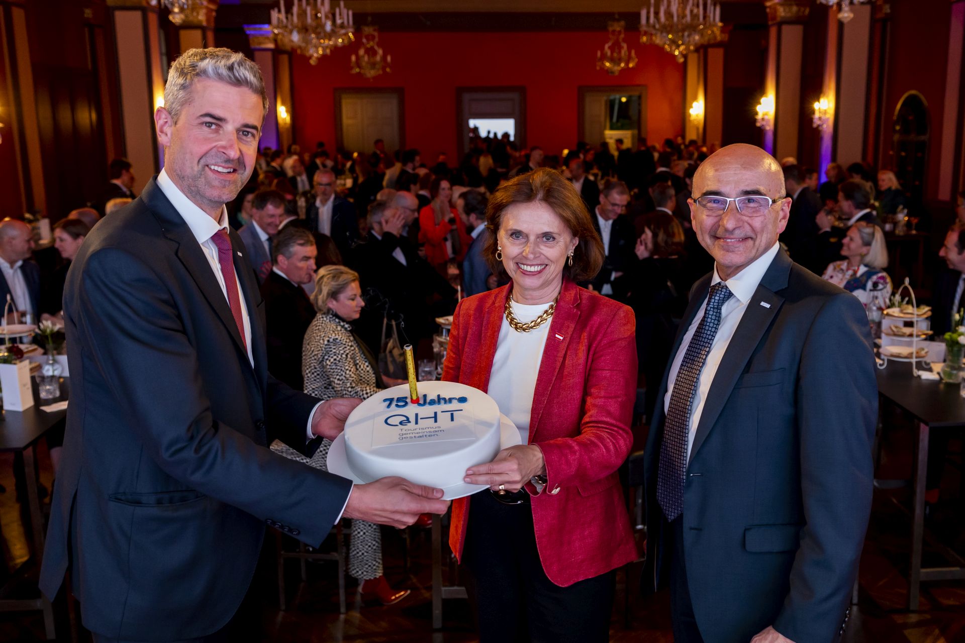 Bild oben: Das Wiener "Casino Zögernitz" wurde zum Schauplatz einer besonderen Feierlichkeit: 75 Jahre Österreichische Hotel- und Tourismusbank. Für die beiden OeHT-Geschäftsführer Matthias Matzer und Martin Hofstetter gab es von Tourismus-Staatssekretärin Susanne Kraus-Winkler eine Torte.