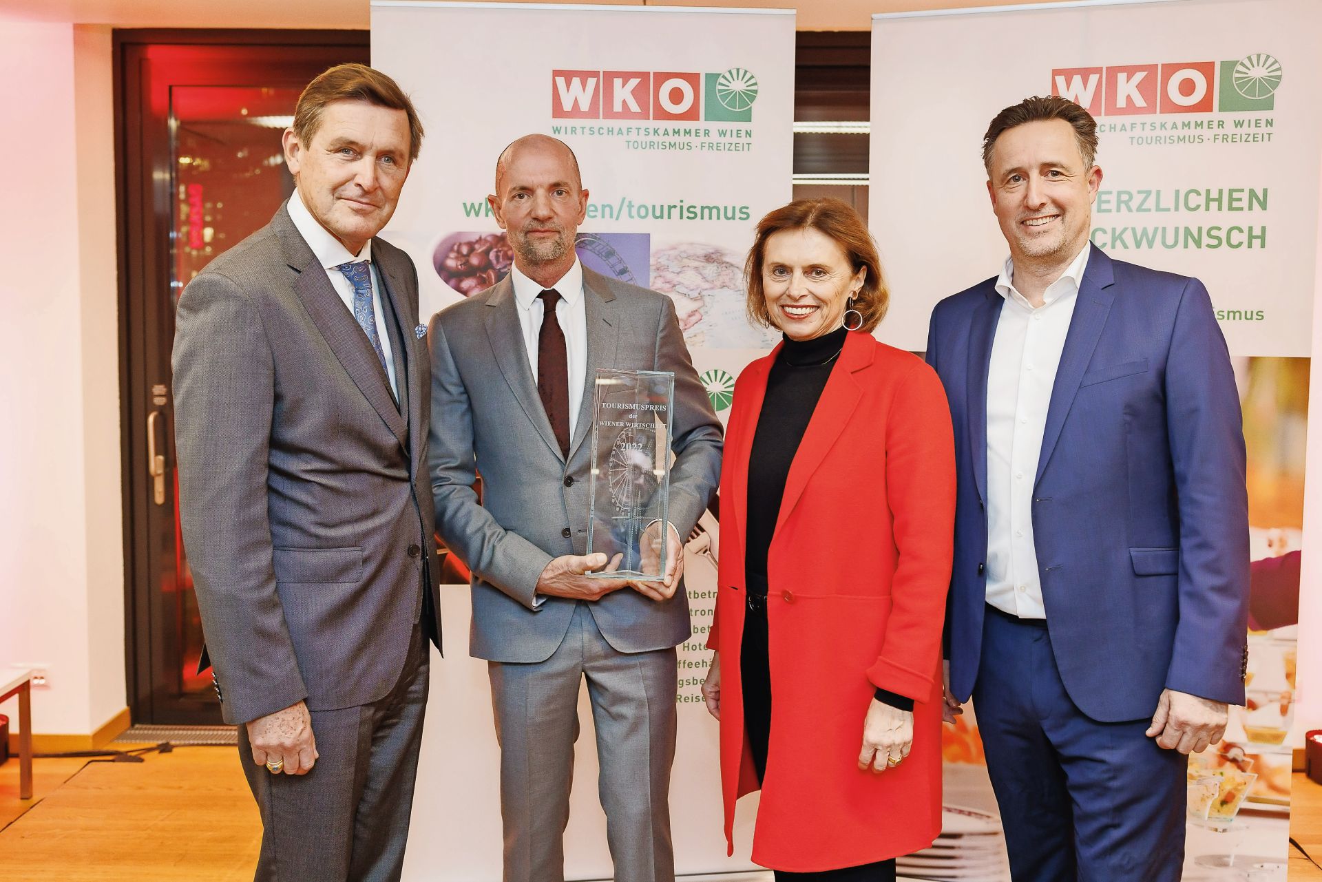 Bild oben: Wirtschaftsstadtrat Peter Hanke, Preisträger Peter Baierl, Tourismus-Staatssekretärin Susanne Kraus-Winkler und der Obmann der Sparte Tourismus und Freizeitwirtschaft in der WKW, Markus Grießler (v. l.).